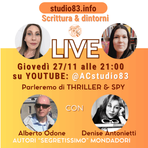 Un nuovo giovedì di chiacchierata live, sul canale YT di Studio83! Con noi una doppietta esplosiva: Denise Antonietti e Alberto Odone sono in nostra compagnia per parlarci di scrittura thriller, action e spy!